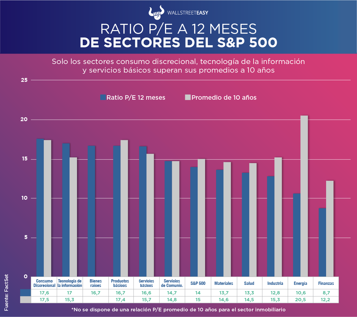 A nivel sectorial, siete sectores tenían el ratio P/E a 12 meses por debajo de sus promedios de 10 años, liderados por: energía (10,6 vs. 20,5); finanzas (8,7 vs. 12,2); industriales (12,8 vs. 15,3). Tres sectores tenían un ratio superior, liderados por el sector tecnología de la información (17,0 vs. 15,3).