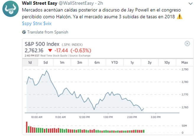 Durante la jornada de este martes, el promedio industrial Dow Jones, cayó 299 puntos después de que Jerome Powell, el nuevo presidente de la Reserva Federal (FED) de los Estados Unidos, se dirigiera al Congreso para detallar las perspectivas del banco central respecto a la política monetaria y el crecimiento económico del país en los próximos años.