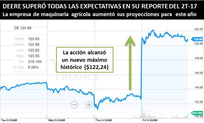 La compañía elevó la expectativa de ganancia para 2017. Ahora Deere espera que sus ventas crezcan +9% y que su ingreso neto para el año fiscal esté alrededor de $2 millardos, por encima de los $1,5 millardos que pronosticaba antes.