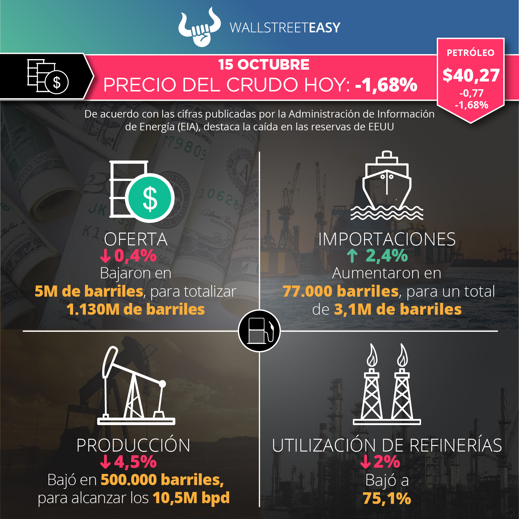La Administración de Información de Energía (EIA, por sus siglas en inglés) reportó 1.130M de barriles en existencias de crudo, tanto comerciales como estratégicas, lo que representa una baja de 5M de barriles. El Instituto Americano del Petróleo (API, por sus siglas en inglés) había estimado una baja de 5,4M de barriles. A continuación, otros datos relevantes del informe: