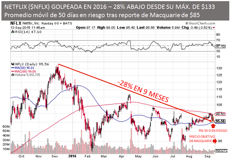 El martes 13 de septiembre, Tim Nollen, analista financiero de Macquarie, proyectó que la acción de Netflix (NFLX), red líder de televisión por internet, caerá a $85 en los próximos 12 meses.