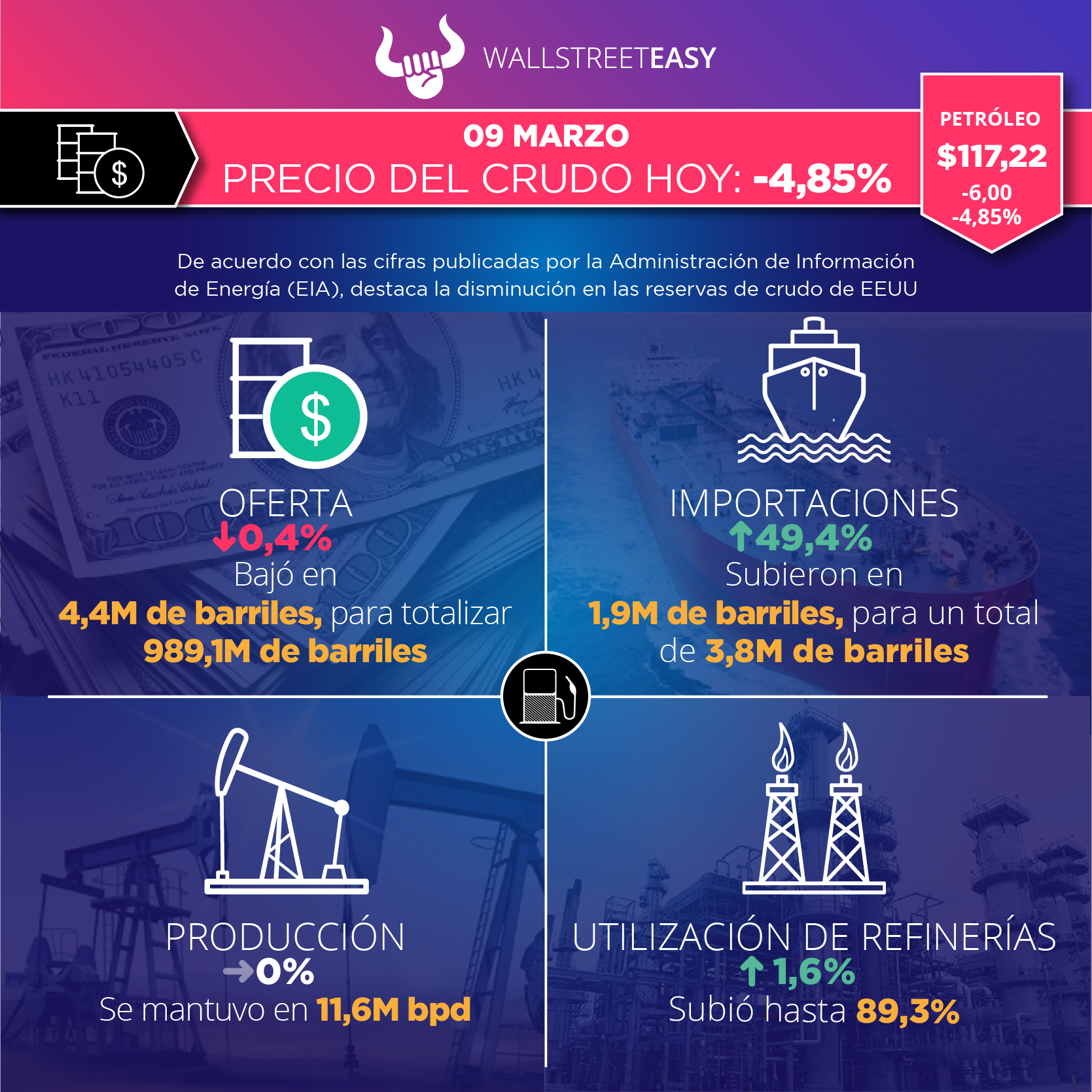 La Administración de Información de Energía (EIA, por sus siglas en inglés) reportó 989,1M de barriles en existencias de crudo, tanto comerciales como estratégicas, lo que representa una disminución de 4,4M de barriles. El Instituto Americano del Petróleo (API, por sus siglas en inglés) había estimado una subida de 2,8M de barriles. A continuación, otros datos relevantes del informe: