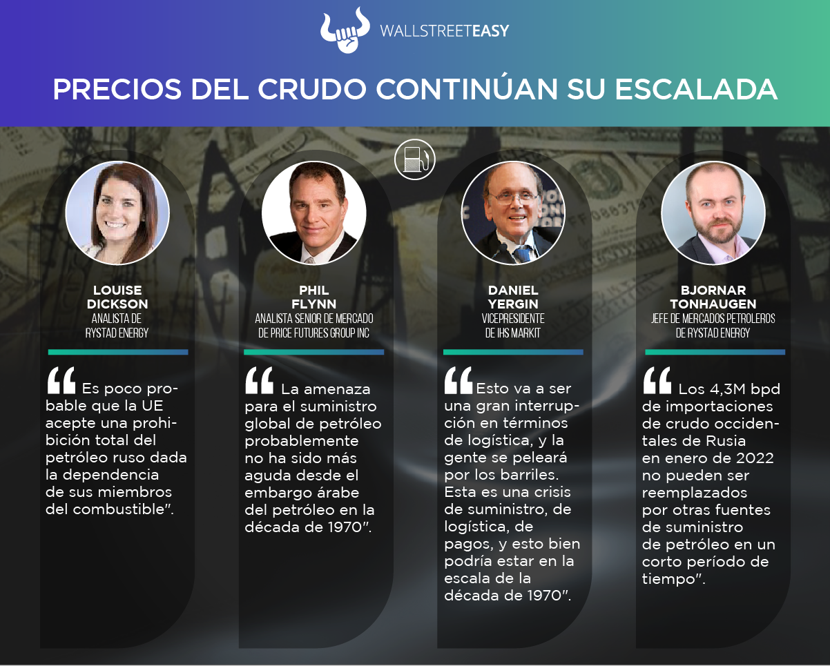 Los precios del petróleo continúan alcanzando niveles más altos ante la continuación de la guerra entre Ucrania y Rusia, donde recientemente se sumó el anuncio del presidente Biden sobre la prohibición de las importaciones rusas, incluido el petróleo. Los analistas piensan que en el corto plazo no será fácil reemplazar los barriles de crudo de Rusia. Nuevo rango esperado es de $93 – $128.