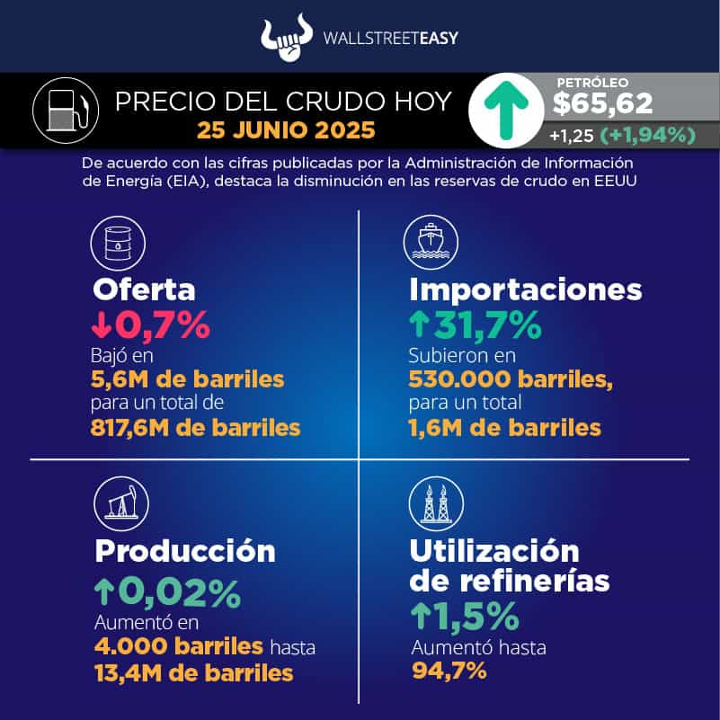 EIA, por sus siglas en inglés) reportó 817,6Mde barriles en existencias de crudo, tanto comerciales como estratégicas, lo que representa una caída de 5,6M de barriles. El Instituto Americano del Petróleo (