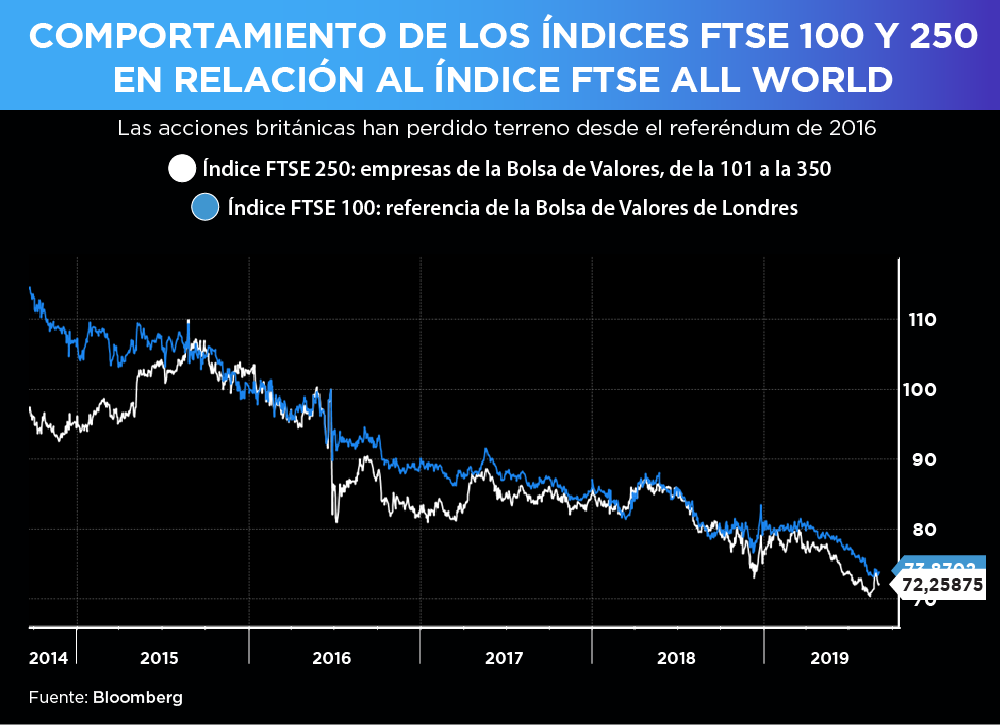 Desde el referendo en 2016, las acciones británicas no han logrado tener un desempeño equivalentes al de las acciones del resto del mundo, sino que han venido perdiendo terreno paulatinamente.