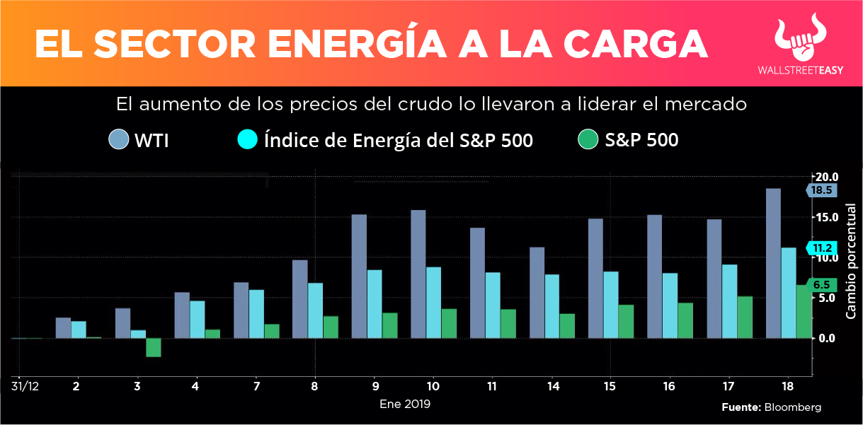 Como podemos observar en el gráfico a continuación, las subidas en el precio del crudo este año han hecho que el sector de Energía lidere el mercado accionario: