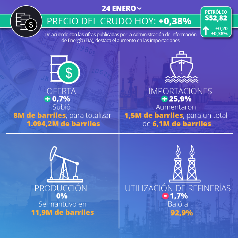 - Ayer, la Casa Blanca reconoció a Juan Guaidó como presidente interino de Venezuela, una medida que conlleva el riesgo de una mayor interrupción de las exportaciones petroleras de la nación. Si EEUU impone sanciones al crudo venezolano, la medida afectaría duramente a algunos refinadores de la Costa del Golfo de EEUU y los obligaría a buscar suministros alternativos, más allá de México y Canadá, ya que ambos tienen limitaciones de disponibilidad.