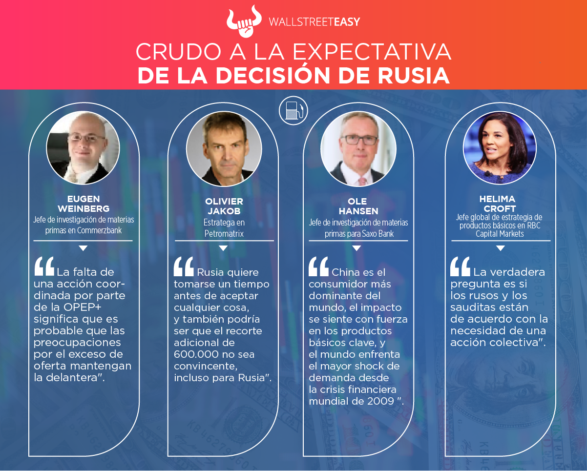 Los precios del crudo iniciaron la semana a la baja, debido a las dudas de Rusia de aprobar un recorte de producción de 600.000 barriles por día. Los analistas creen que el recorte puede que no sea convincente para Moscú. De no haber una acción coordinada por la OPEP+, el mercado espera que se mantengan las preocupaciones por el exceso de oferta de crudo. Nuevo rango esperado es de $49 – $51.