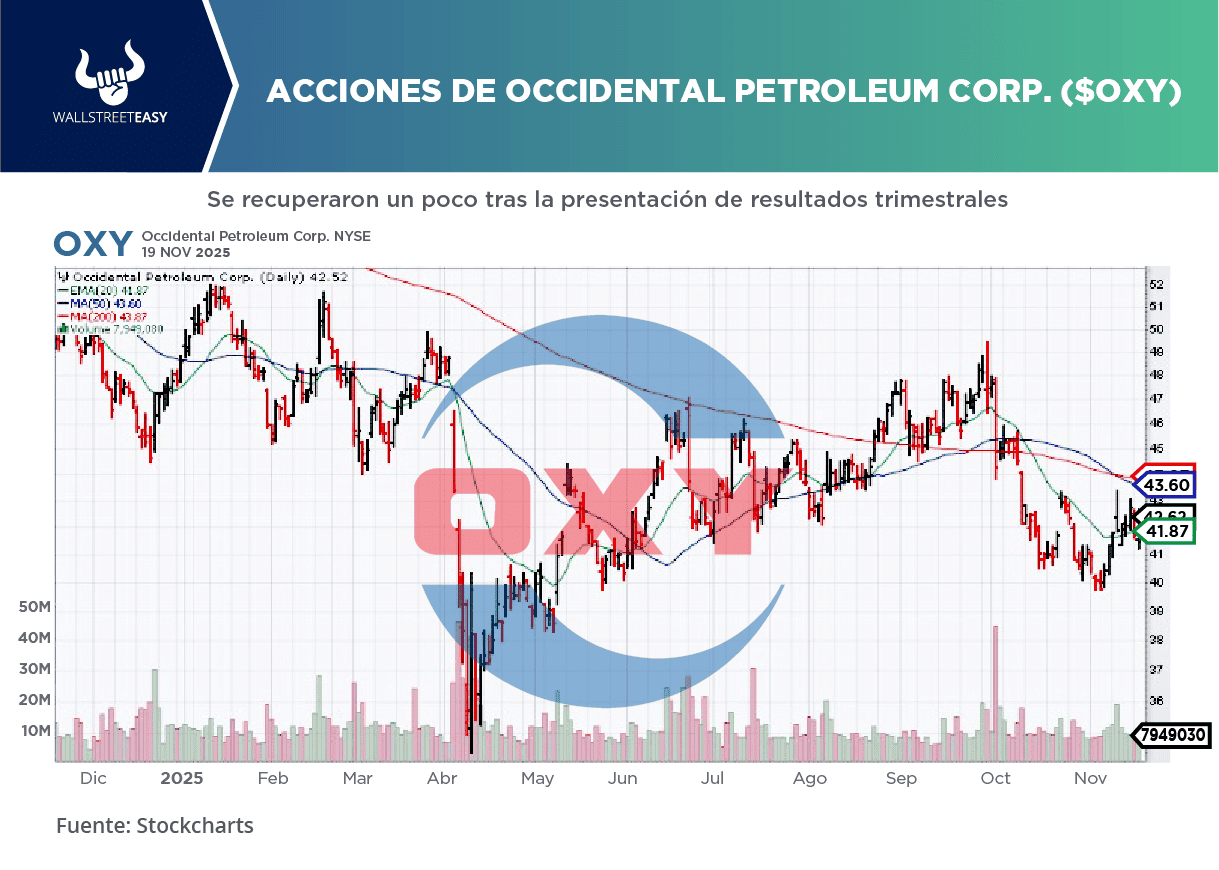LA NOTICIA Occidental Petroleum ($OXY) publicó sus resultados del tercer trimestre, revelando un beneficio por acción de $0,64, superando las estimaciones en 15 centavos. PONME AL DÍA Los ingresos de la empresa se situaron en $6.720M, lo que supone un descenso interanual del 6% y no alcanzó las expectativas en $20M. La petrolera no ha sido capaz de superar las estimaciones consensuadas de ingresos en los últimos cuatro trimestres. ES MÁS A pesar de no alcanzar los ingresos previstos, el beneficio por acción supera las expectativas y ofrece una nota positiva para los inversionistas en un entorno difícil para el mercado petrolero. ¿POR QUÉ ES RELEVANTE? Occidental alcanzó un hito en la cuenca del Pérmico, con una producción que alcanzó los 800.000 bpd. Esto supone la mayor producción trimestral en la historia de la empresa, lo que subraya su sólida capacidad operativa en esta región clave. ¿ALGUNA NOVEDAD ADICIONAL? La compañía ha logrado avances significativos en la reducción de su deuda, reembolsando $1.300M y reduciendo el saldo de su deuda principal a $20.800M. Se espera que la venta estratégica de OxyChem reduzca aún más la deuda por debajo de los $15.000M. POR ÚLTIMO Occidental se enfrentó a retos con sus activos internacionales, que obtuvieron resultados ligeramente inferiores a los esperados. Sin embargo, el buen rendimiento en EEUU ayudó a compensar estos retos, manteniendo los niveles generales de producción. EN CONCRETO La empresa logró una importante eficiencia de costos, reduciendo los gastos de capital en $300M y los costos operativos en $170M. Desde 2023, Occidental ha conseguido un ahorro anualizado de $2.000M.