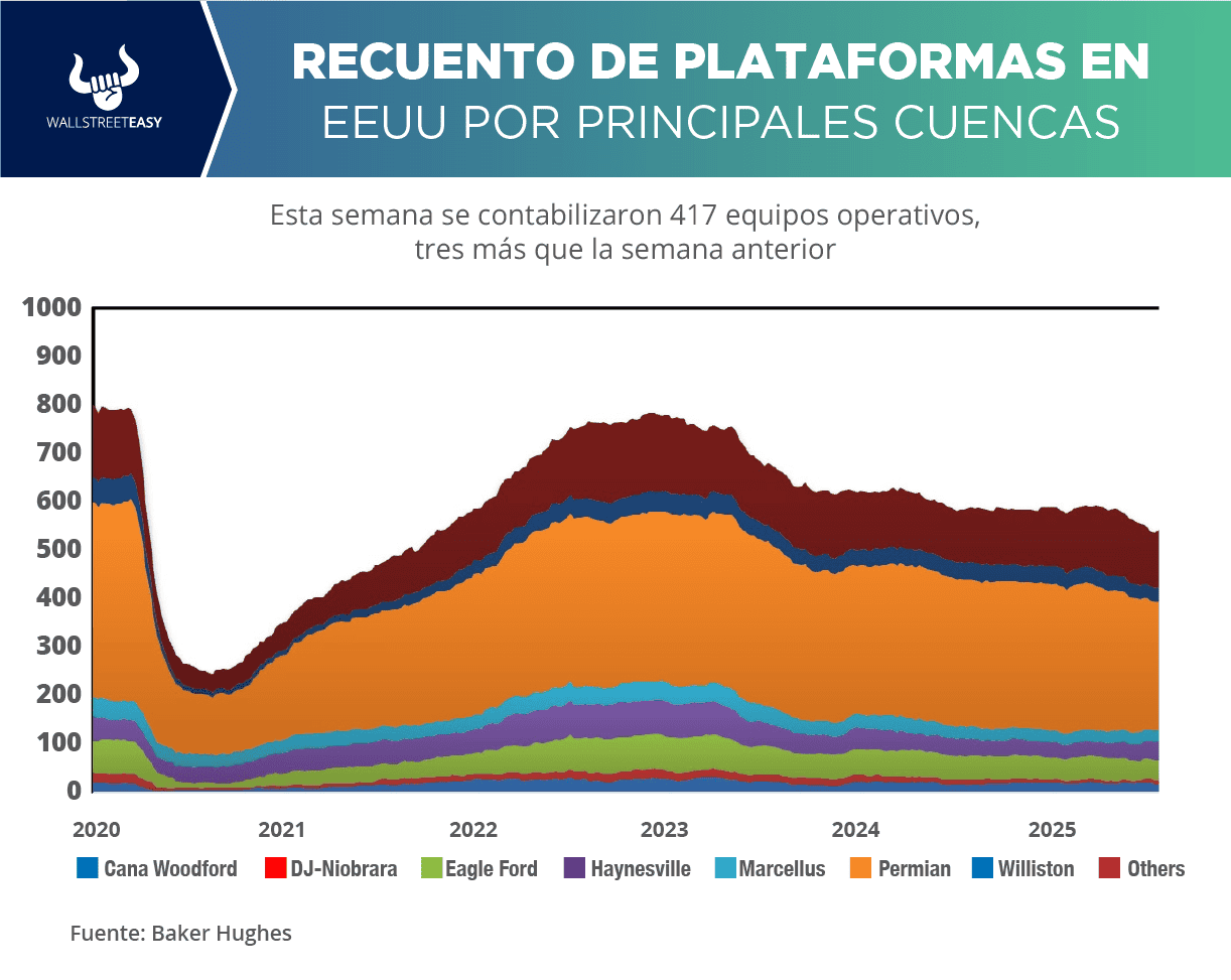 CUÉNTAME SOBRE LAS PLATAFORMAS PETROLERAS EN EEUU De acuerdo con información de Baker Hughes, actualmente en EEUU se encuentran 549 equipos activos (incluyendo los de gas). En la actividad petrolera se contabilizaron 417, tres más que la semana anterior. En las operaciones de gas hay 125 equipos operativos, tres menos más que hace siete días. Hace un año estaban activas 584 plataformas.