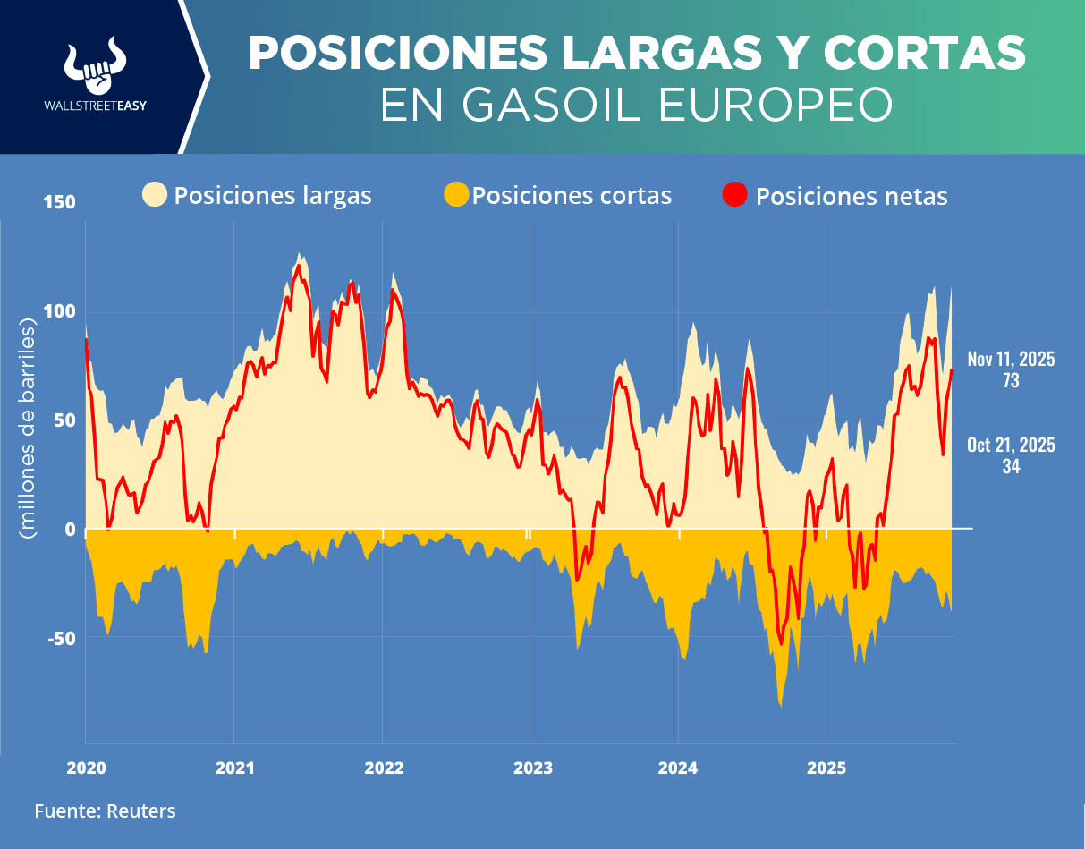 LA NOTICIA Los inversionistas se muestran cada vez más optimistas sobre las perspectivas del gasóleo europeo tras la publicación de las normas detalladas sobre la prohibición de la UE de importar combustible elaborado a partir de crudo ruso y los repetidos ataques de Ucrania a las refinerías rusas. DAME CONTEXTO Los fondos de cobertura y otros gestores de fondos compraron el equivalente a otros 9M de barriles de futuros y opciones sobre gasóleo europeo durante los siete días que terminaron el 11 de noviembre. ¿ALGÚN ACONTECIMIENTO ADICIONAL? Los gestores de fondos han comprado un total de 39M de barriles desde que la Unión Europea publicó a finales de octubre las normas detalladas para aplicar la próxima prohibición de importar combustible elaborado a partir de crudo ruso.