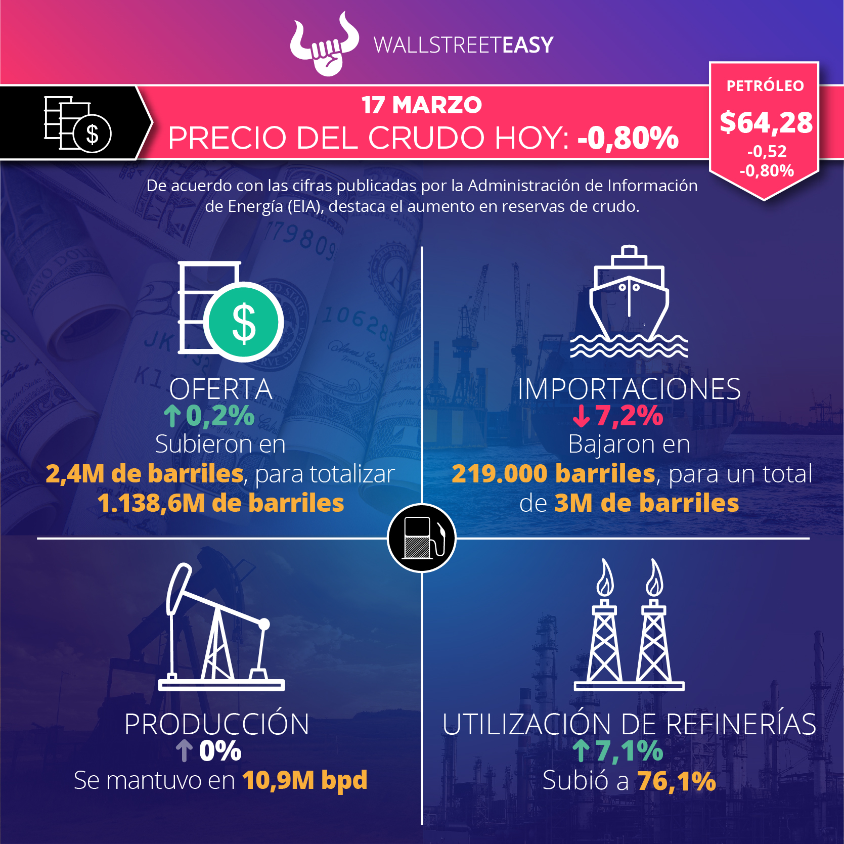 La Administración de Información de Energía (EIA, por sus siglas en inglés) reportó 1.138,6M de barriles en existencias de crudo, tanto comerciales como estratégicas, lo que representa un aumento de 2,4M de barriles. El Instituto Americano del Petróleo (API, por sus siglas en inglés) había estimado una baja de 1M de barriles. A continuación, otros datos relevantes del informe: