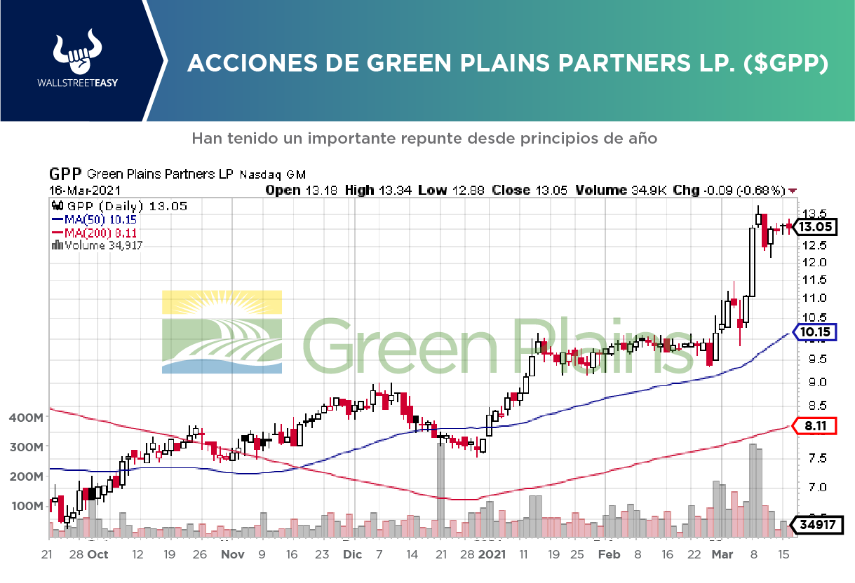 Para Green Plains Inc. (GPRE), empresa matriz de Green Plain Partners, el precio de sus acciones se ha disparado +105% en solo un año, y +66% durante el último trimestre, a pesar de que sus ingresos cayeron –20% durante 2020, producto de la crisis por el COVID-19.