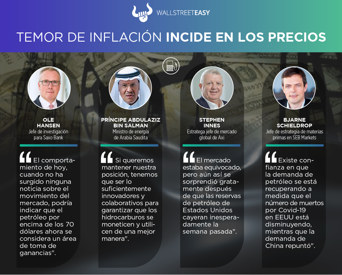 - «La positividad que ayudó a que los precios alcanzaran y se mantuvieran cerca de $70 por barril a principios de este mes se ha evaporado, dando paso a preocupaciones sobre los reveses de las campañas de vacunación y los niveles de existencias de crudo», dijo Bjornar Tonhaugen de Rystad Energy.
