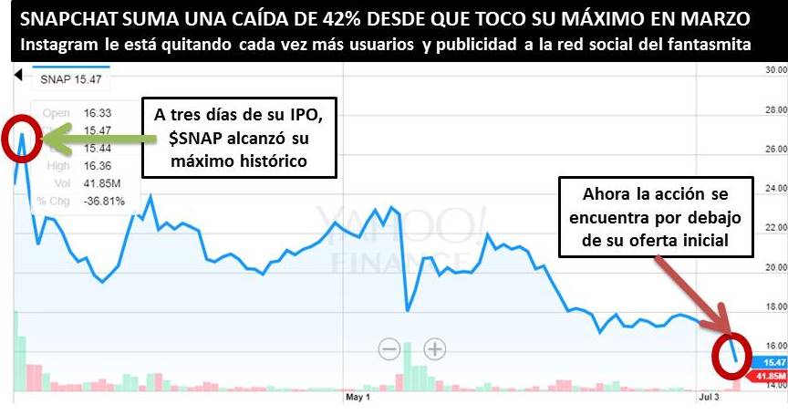 El lunes 10 de julio, la red social del fantasmita, Snapchat (SNAP), cerró por primera vez su cotización por debajo de los $17 estipulados en su oferta inicial pública (IPO) realizada en marzo.