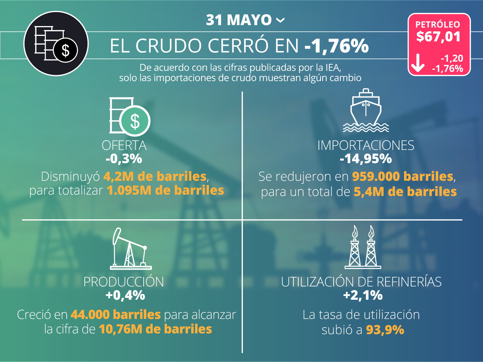 La Administración de Información de Energía (EIA, por sus siglas en inglés) reportó 1.095M de barriles en existencias de crudo, tanto comerciales como estratégicas, lo que representa un descenso de 4,2M de barriles. El Instituto Americano del Petróleo (API, por sus siglas en inglés) había estimado un aumento de 1M. A continuación otros datos del informe: