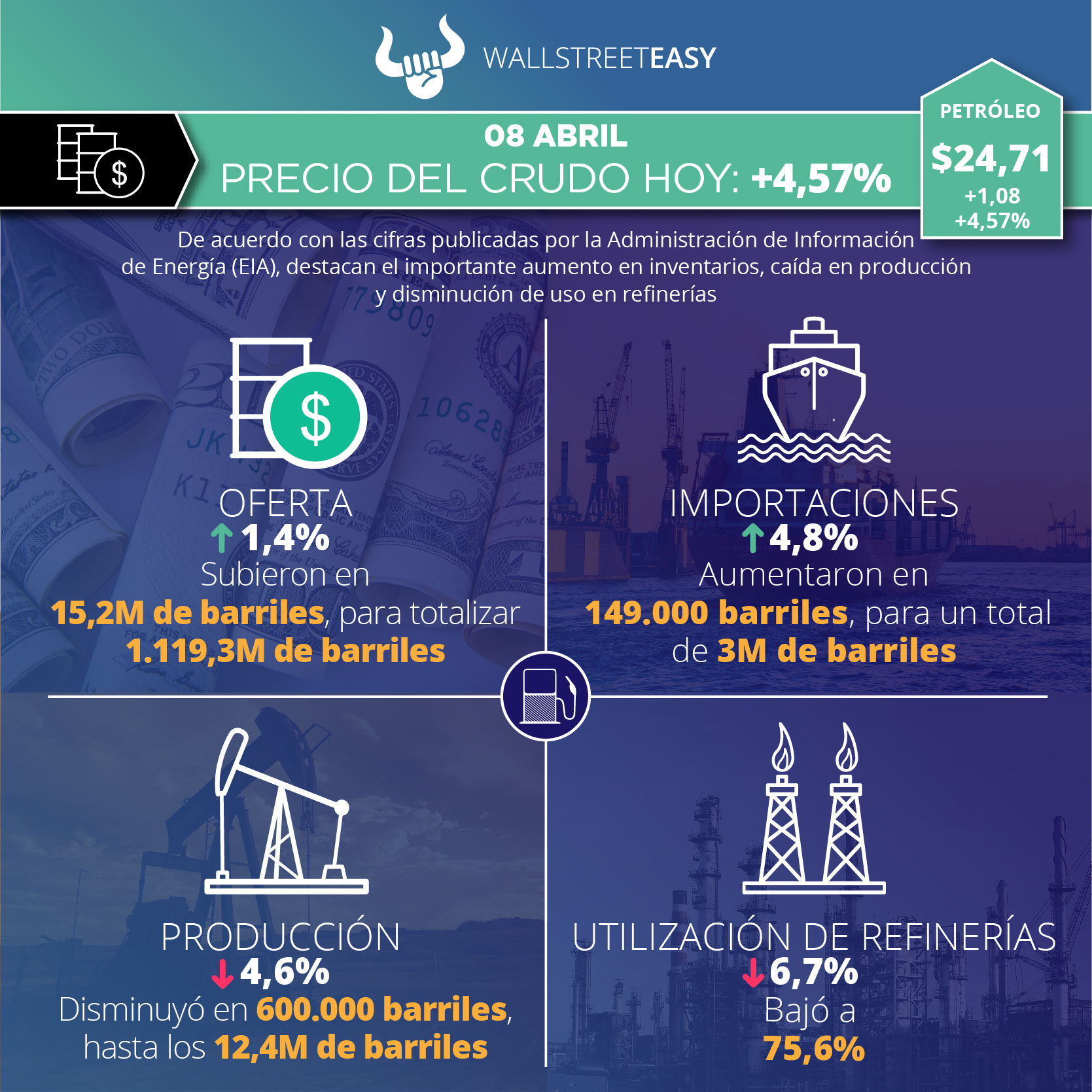 Al cierre de esta edición, el precio del barril subió hasta $24,71, lo que representa +4,57% en comparación con el día martes.