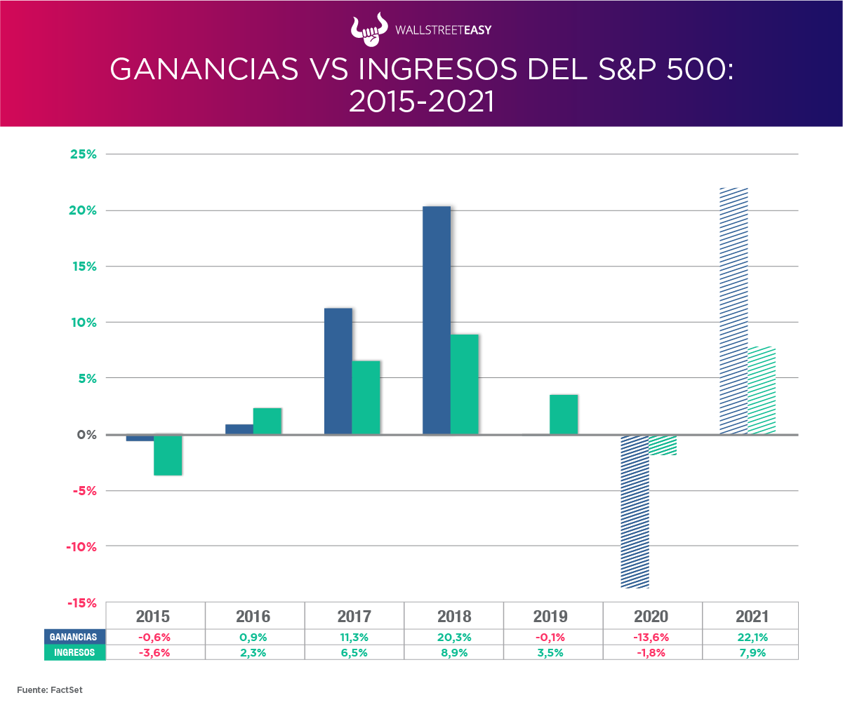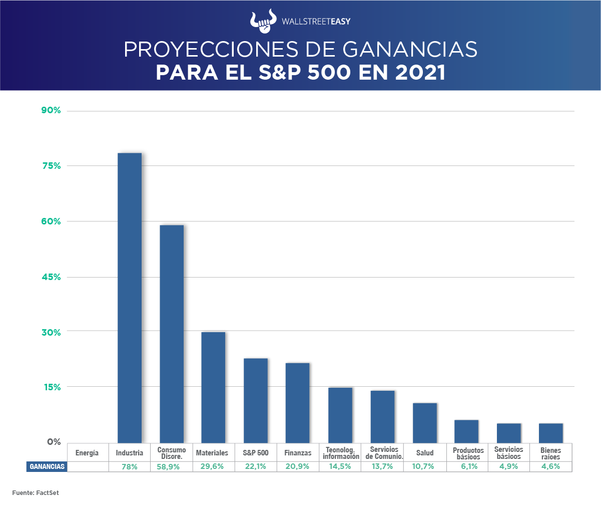 La tasa de crecimiento de ganancias estimada (año tras año) para el S&P 500 para 2021 es del 22,1%, que está por encima de la tasa de crecimiento de ganancias promedio (anual) de 10 años del 10%. Si termina siendo ese número, sería la tasa más alta desde el 2010 (+39,6%). Que sea inusualmente alta se puede atribuir a las débiles ganancias de 2020 (COVID-19) como a una mejora esperada para 2021.