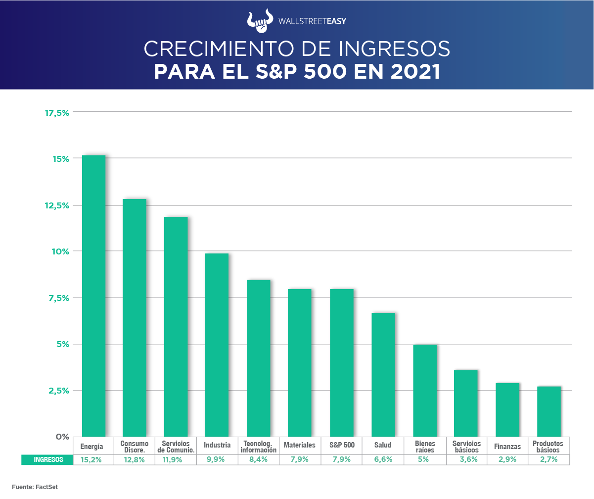 Se espera que el sector energía informe una ganancia de $24.000M en 2021, en comparación con una pérdida esperada de $3.700M en 2020. Debido a esta pérdida, no se puede calcular una tasa de crecimiento año tras año para el sector: