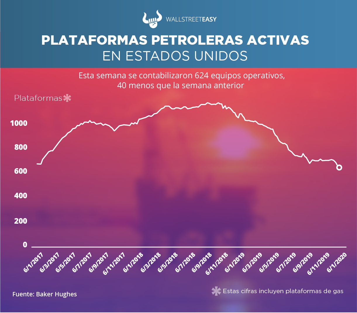 De acuerdo con información de Baker Hughes, actualmente en EEUU se encuentran 728 equipos activos (incluyendo los de gas). En la actividad petrolera se contabilizaron 624, 40 menos que la semana anterior. En las operaciones de gas hay 102 equipos operativos, cuatro menos que hace siete días. Hace un año estaban activas 1006 plataformas.