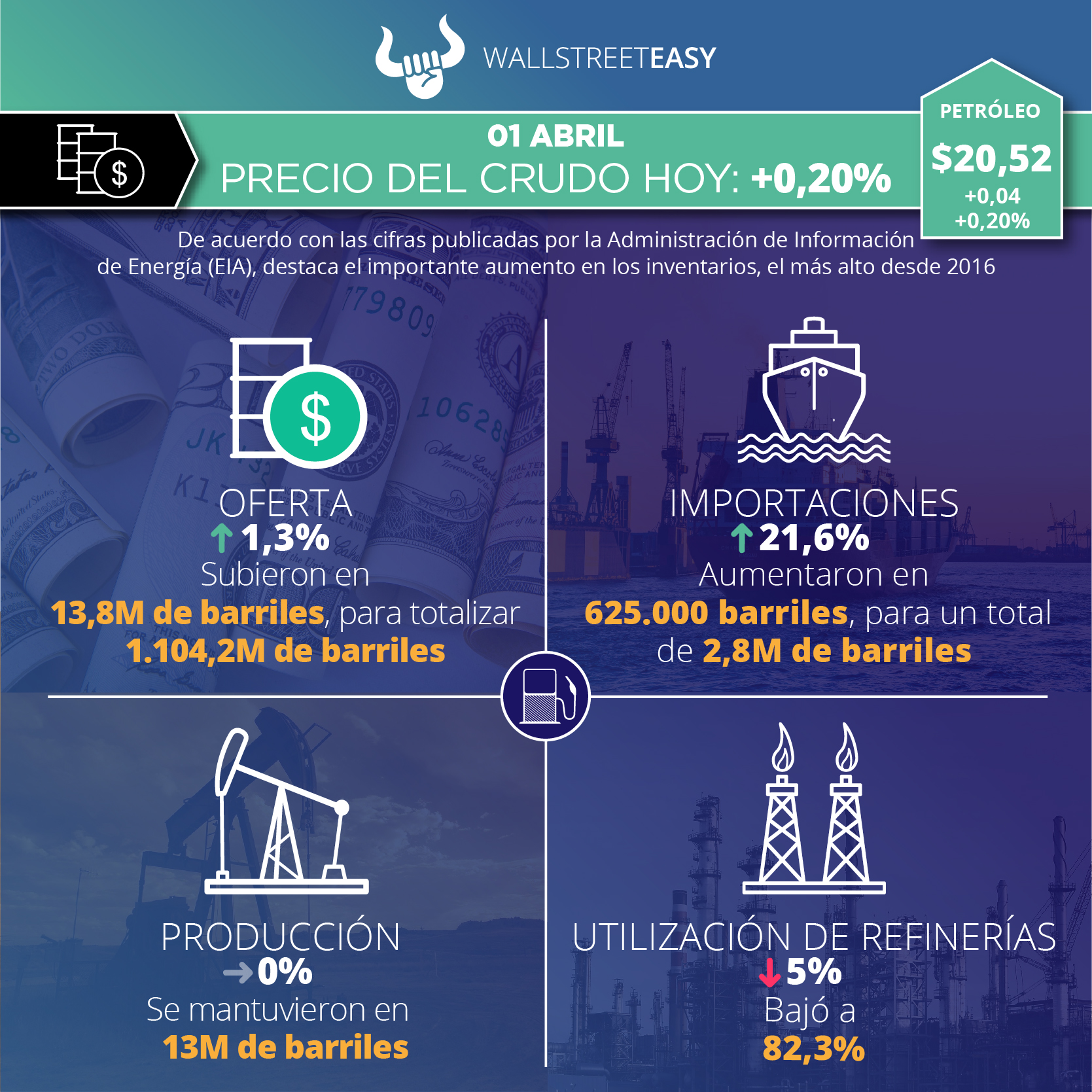Al cierre de esta edición, el precio del barril subió hasta $20,52, lo que representa +0,20% en comparación con el día martes.