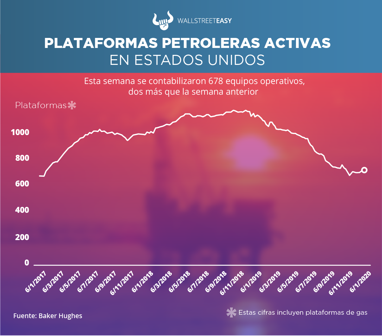 De acuerdo con información de Baker Hughes, actualmente en EEUU se encuentran 788 equipos activos (incluyendo los de gas). En la actividad petrolera se contabilizaron 678, dos más que la semana anterior. En las operaciones de gas hay 110 equipos operativos, uno menos que hace siete días. Hace un año estaban activas 1028 plataformas.
