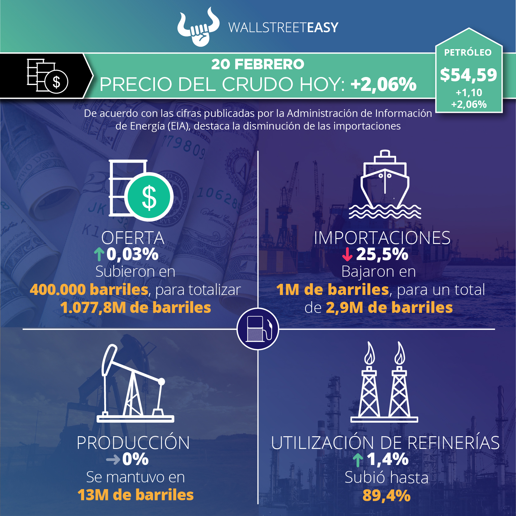 La Administración de Información de Energía (EIA, por sus siglas en inglés) reportó 1.077,8M de barriles en existencias de crudo, tanto comerciales como estratégicas, lo que representa un aumento de 400.000 barriles. El Instituto Americano del Petróleo (API, por sus siglas en inglés) había estimado una subida de 4,1M de barriles. A continuación, otros datos relevantes del informe: