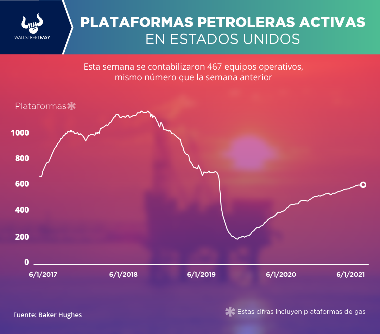 De acuerdo con información de Baker Hughes, actualmente en EEUU se encuentran 569 equipos activos (incluyendo los de gas). En la actividad petrolera se contabilizaron 467, mismo número que la semana anterior. En las operaciones de gas hay 102 equipos operativos, sin cambios comparado con los siete días previos. Hace un año estaban activas 323 plataformas.