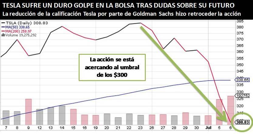 ¡Qué mala semana para Tesla! Desde el lunes 3 de julio la acción de TSLA ha caído 15%, acercándose al umbral de los $300.