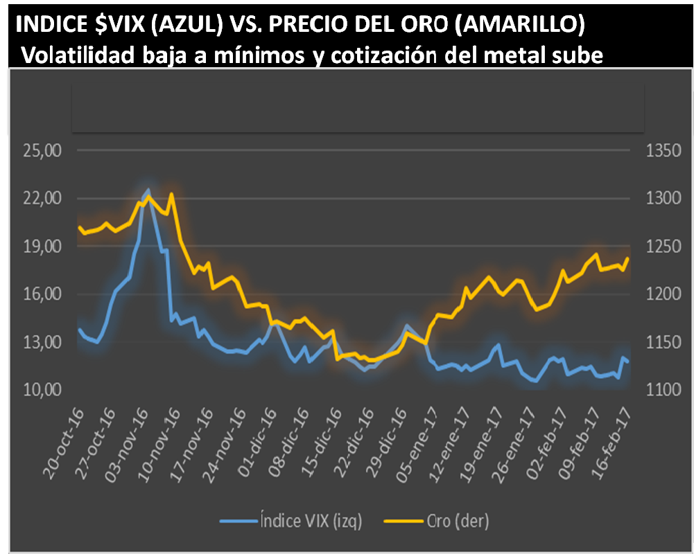 Un mercado con baja volatilidad se ha observado desde el pasado noviembre, cuando Donald Trump ganó las elecciones presidenciales. El índice de volatilidad (VIX) cayó a su mínimo de tres años el pasado mes de enero. En este escenario, al oro le correspondía mostrarse tímido.