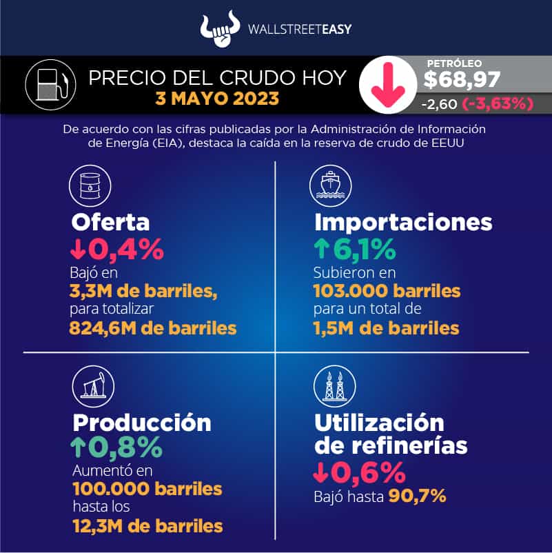 EIA, por sus siglas en inglés) reportó 824,6M de barriles en existencias de crudo, tanto comerciales como estratégicas, lo que representa una baja de 3,3M de barriles. El Instituto Americano del Petróleo (