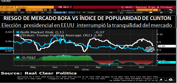 En términos generales, el mayor miedo lo genera Donald Trump si llega a ganar las elecciones, porque pudiera provocar que los inversionistas empezaran a vender acciones para irse a la seguridad de la renta fija y activos refugio como el oro mientras ven si se cumplen sus amenazas.