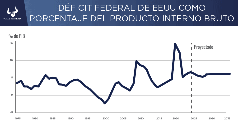 El déficit federal ascendería al 6,2% del producto interior bruto (PIB) en 2025 y desciende al 5,2% en 2027, dado que los ingresos aumentan más rápido que los gastos. En años posteriores, los gastos aumentan, en promedio, más rápido que los ingresos. En 2035, el déficit ajustado equivale al 6,1% del PIB, significativamente más que el 3,8 % que los déficits han promediado en los últimos 50 años.