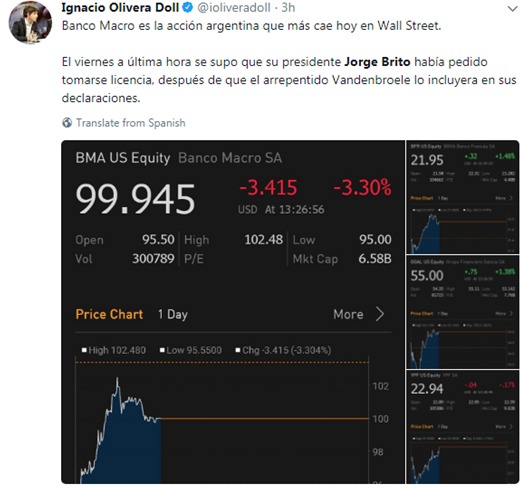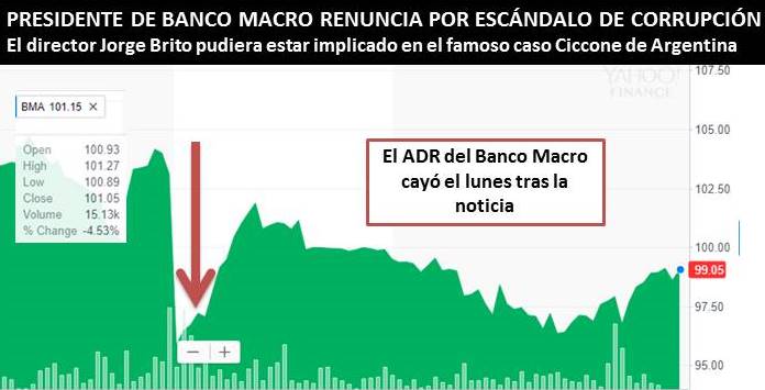 El viernes 17 de noviembre, el director del Banco Macro, Jorge Brito, pidió una licencia después de su posible vinculación con el caso Ciccone en Argentina.