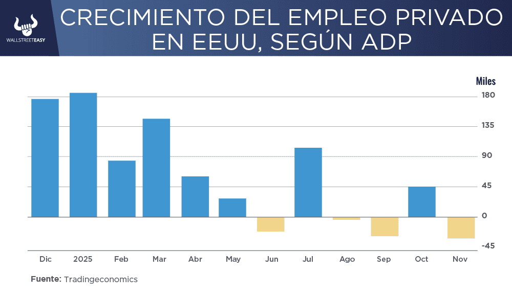 Si noviembre hubiera representado una verdadera recuperación técnica de los puestos perdidos en octubre, la cifra de creación de empleo debería haber sido sustancialmente superior para compensar el déficit. Esta incapacidad de rebote queda confirmada por el reporte de la empresa de gestión de nóminas ADP, que reveló que el sector privado destruyó inesperadamente 32.000 puestos adicionales en noviembre, sugiriendo que la debilidad subyacente es real y no puramente estadística.