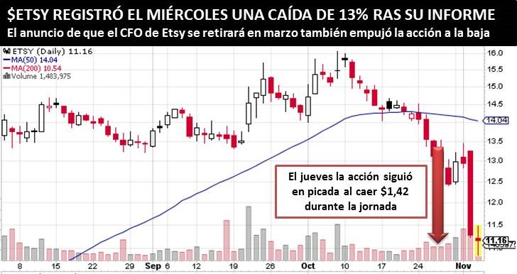 El jueves 3 de noviembre la acción de Etsy (ETSY), empresa de ventas y compras online de artesanías, continuó en caída (–1,42%) después de publicar el miércoles su informe del tercer trimestre del año, el cual hizo que la acción se desplomara ese día –13%.