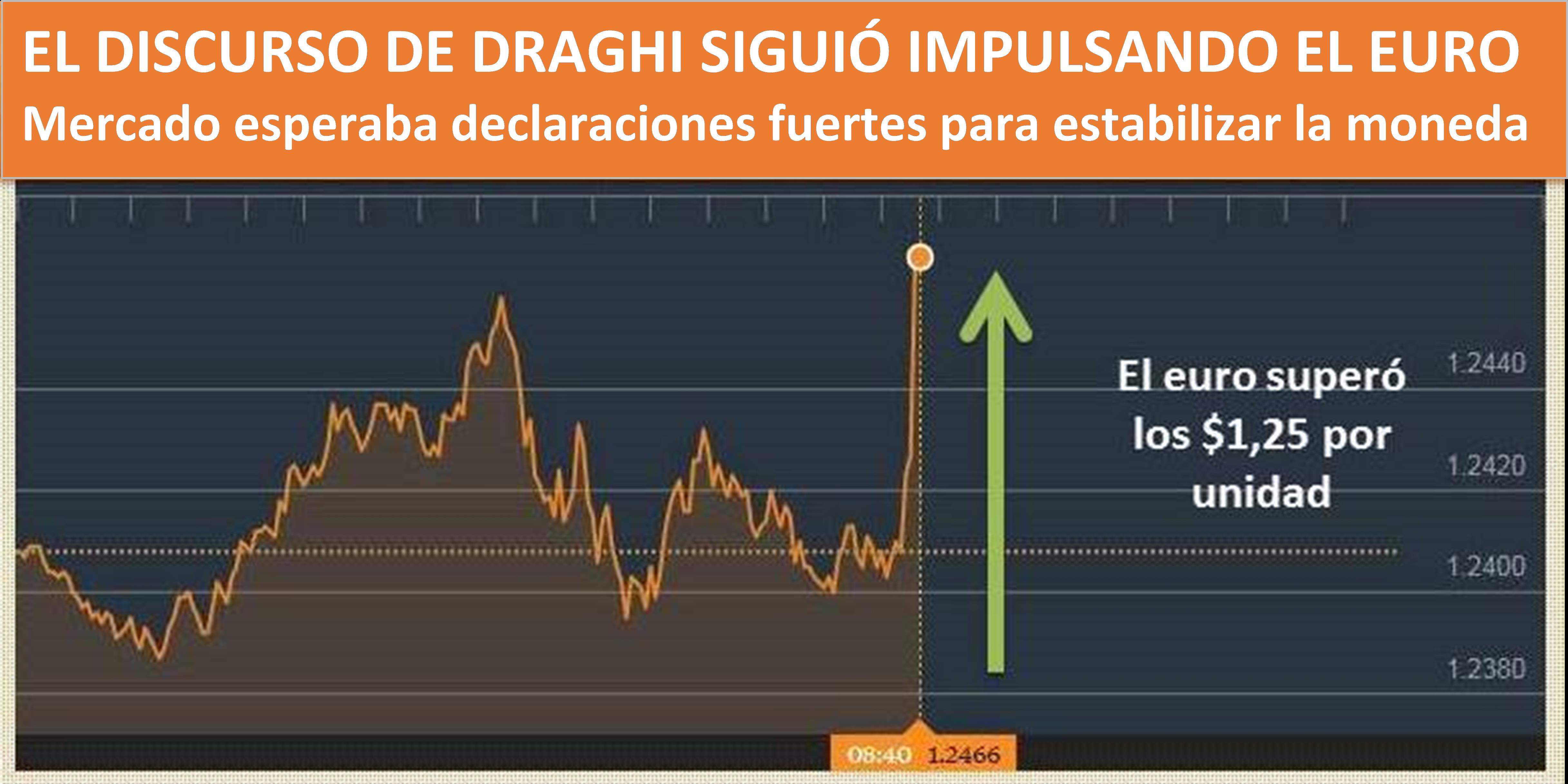 Se esperaba que Draghi intentara disminuir la fortaleza del euro con su discurso, pero esto no sucedió y mientras el presidente del BCE hablaba el euro se aceleraba.