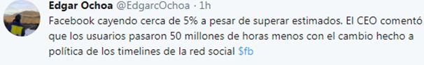 «El trimestre pasado, hicimos cambios para mostrar menos videos virales para asegurarnos de que el tiempo de las personas esté bien invertido. En total, hicimos cambios que redujeron el tiempo pasado en Facebook en aproximadamente 50 millones de horas al día. Ayudar a las personas a conectarse es más importante que maximizar el tiempo que pasan en Facebook» – Declaraciones del CEO de la empresa, Mark Zuckerberg, en la llamada de ganancias de la compañía.