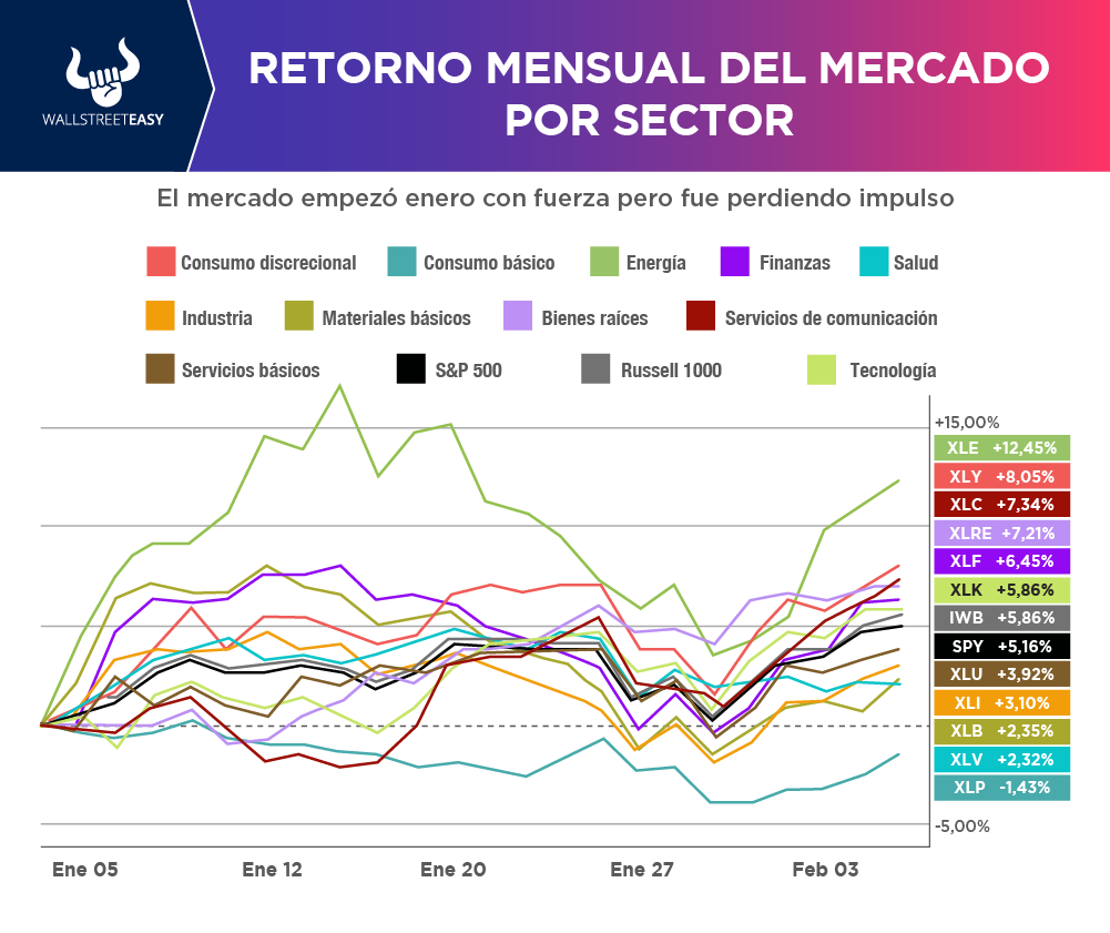 La distribución de los retornos del mes de enero deja claro que se dio una toma de ganancias importante en los sectores beneficiados por la rotación entre tecnología y momentum, a empresas más asociadas a la economía real.