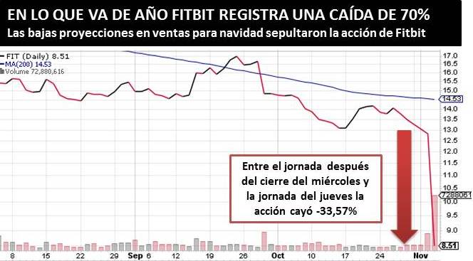 El jueves 3 de noviembre, la acción de Fitbit (FIT), empresa de pulseras para medir calorías, se desplomó (–33,57%) tras reportar su informe trimestral y proyectar ventas para el 4T entre $725 millones y $750 millones, –23% de lo esperado por los analistas
