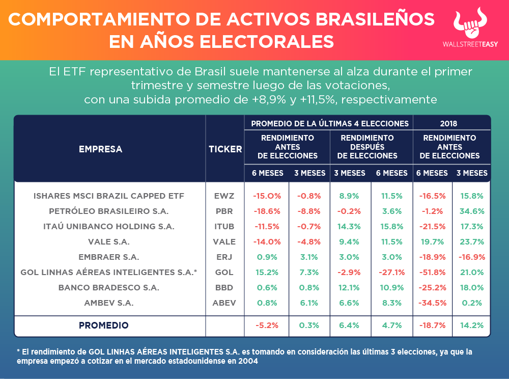 Pero el rendimiento positivo de estas compañías va más allá de eso, pues también en los últimos cuatro años de elecciones, las acciones y demás activos financieros brasileños se mantienen en una buena racha por, al menos, unos seis meses, como hasta ahora lo ha demostrado el ETF iShares MSCI Brazil (EWZ), el cual es el fondo cotizado representativo del gigante suramericano.