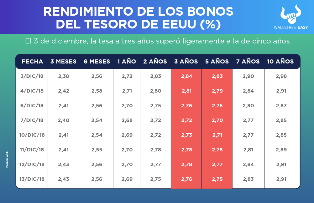 También observamos que el 3 de diciembre, por primera vez desde 2008, la curva de rendimiento se invirtió un poco. Esto se produce cuando la tasa de interés de los bonos de corto plazo supera la de más largo plazo. En dicha fecha la tasa a tres años superó ligeramente la de cinco años.