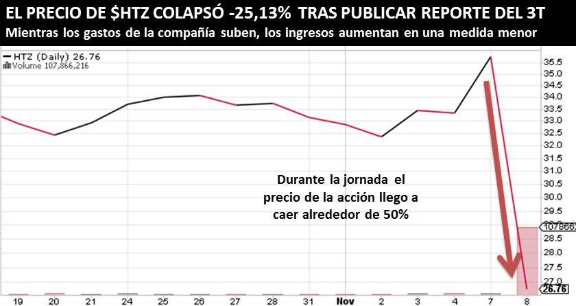 El martes 8 de noviembre, el precio de la acción de Hertz Global Holdings (HTZ) cayó 25,13% tras publicar su reporte del 3T.