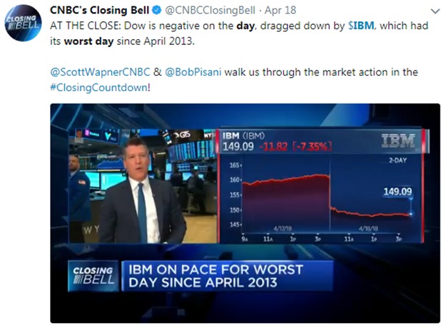 La acción cerró el miércoles a $ 148.79, lo que representa el peor día en la bolsa de la compañía desde abril de 2013, y coloca a IBM bien en territorio de corrección en más del -13% de su máximo de 52 semanas.