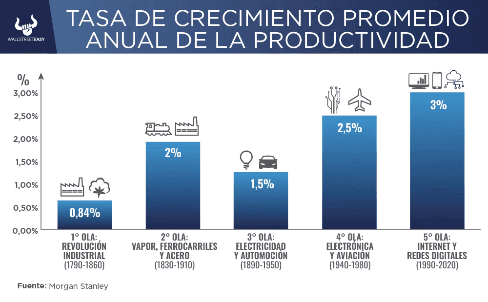 Para contextualizar ese fenómeno, se analizaron cinco grandes oleadas de innovación en la historia de EEUU, desde la Revolución Industrial hasta la llegada del Internet. El patrón histórico es consistente: la innovación reconfigura las estructuras económicas, la forma en que las empresas producen y dónde vive la gente, pero al final termina complementando el empleo. Por ejemplo, durante la primera Revolución Industrial, el empleo agrícola cayó del 75% al 50%, pero los puestos en manufactura y construcción se duplicaron, creando nuevas oportunidades de subsistencia.