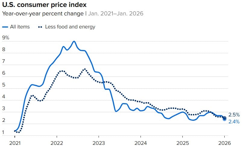 Este 13 de febrero de 2026 se publicaron los datos de inflación de Estados Unidos correspondientes a enero, y el resultado fue claramente mejor de lo que el mercado esperaba. La inflación general avanzó 0,2% en el mes, por debajo del 0,3% estimado, mientras que la tasa interanual se moderó a 2,4%. En comparación, el mercado venía preparado para un dato más alto y, además, se trató de una desaceleración relevante frente al registro previo, lo que refuerza la idea de que el proceso desinflacionario sigue en marcha.