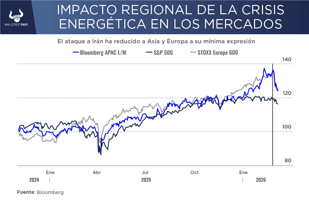 La geografía juega un rol determinante en esta crisis. Asia y Europa, debido a su dependencia de las importaciones energéticas y su cercanía física al epicentro del conflicto, han sufrido mayores pérdidas bursátiles en comparación con EEUU.