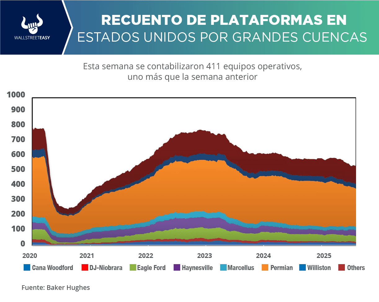 Baker Hughes, actualmente en EEUU se encuentran 539 equipos activos (incluyendo los de gas). En la actividad petrolera se contabilizaron 411, uno más que la semana anterior. En las operaciones de gas hay 123 equipos operativos, uno menos que hace siete días. Hace un año estaban activas 588 plataformas.