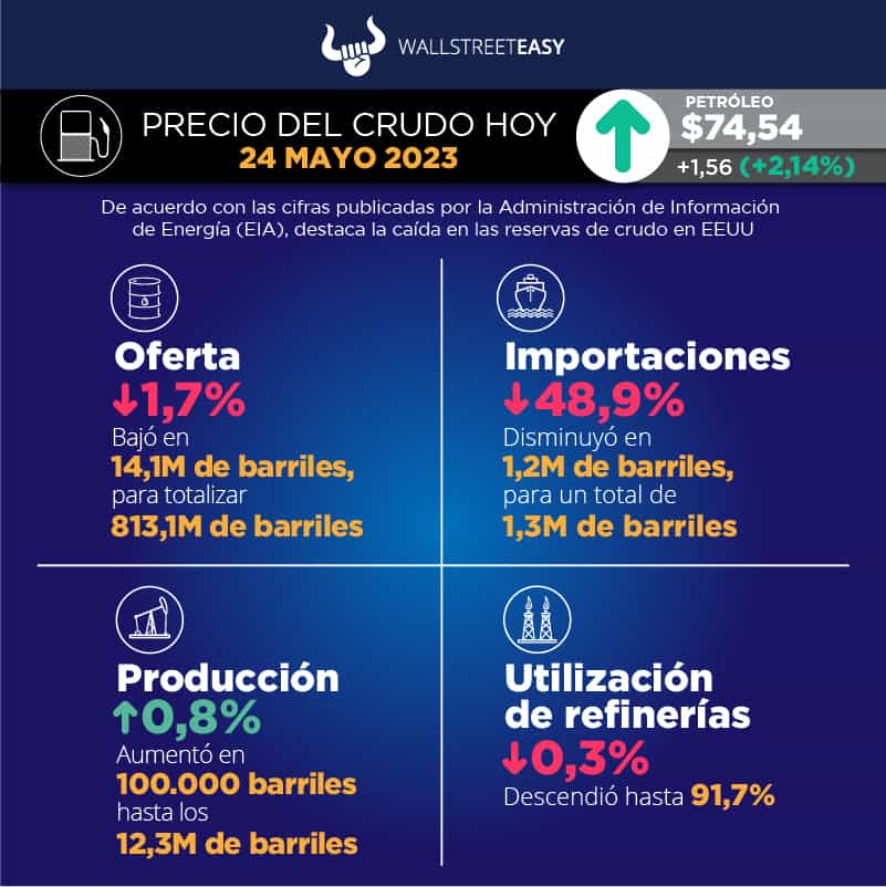 Al cierre de esta edición, el precio del barril subió hasta $74,54, lo que representa +2,14% en comparación con el día martes.