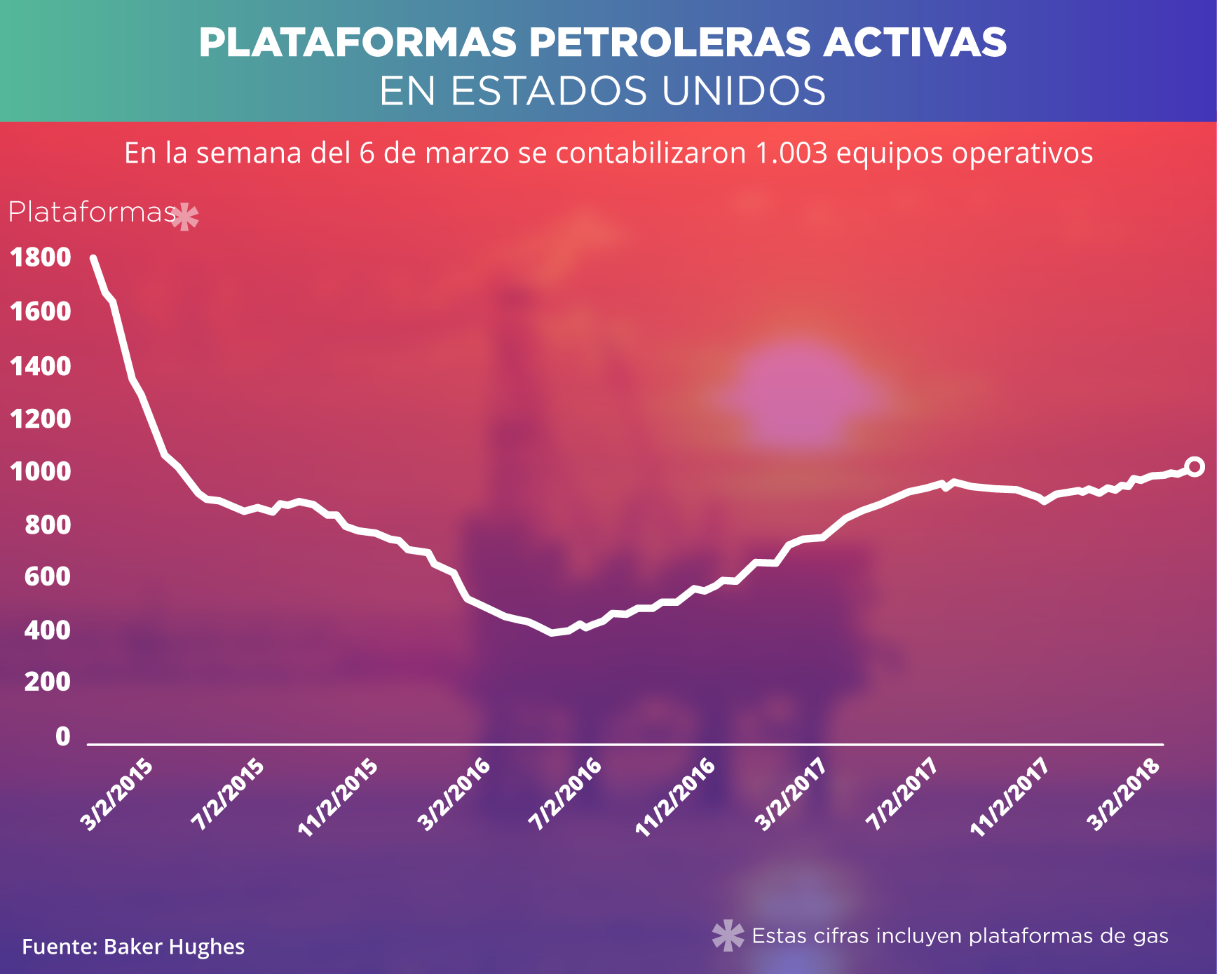 De acuerdo con Baker Hughes, actualmente en EEUU se encuentran 1.003 equipos activos para la actividad petrolera, lo que representa un aumento de +10% en relación con la semana pasada, y de +164% en comparación con esta fecha el año pasado.